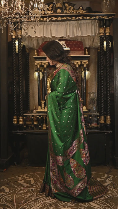 Aaranya || Forest Green Mashru Silk Banarasi Saree with all over Matte Gold Zari & multi-colour Meenakari Buta and Floral border