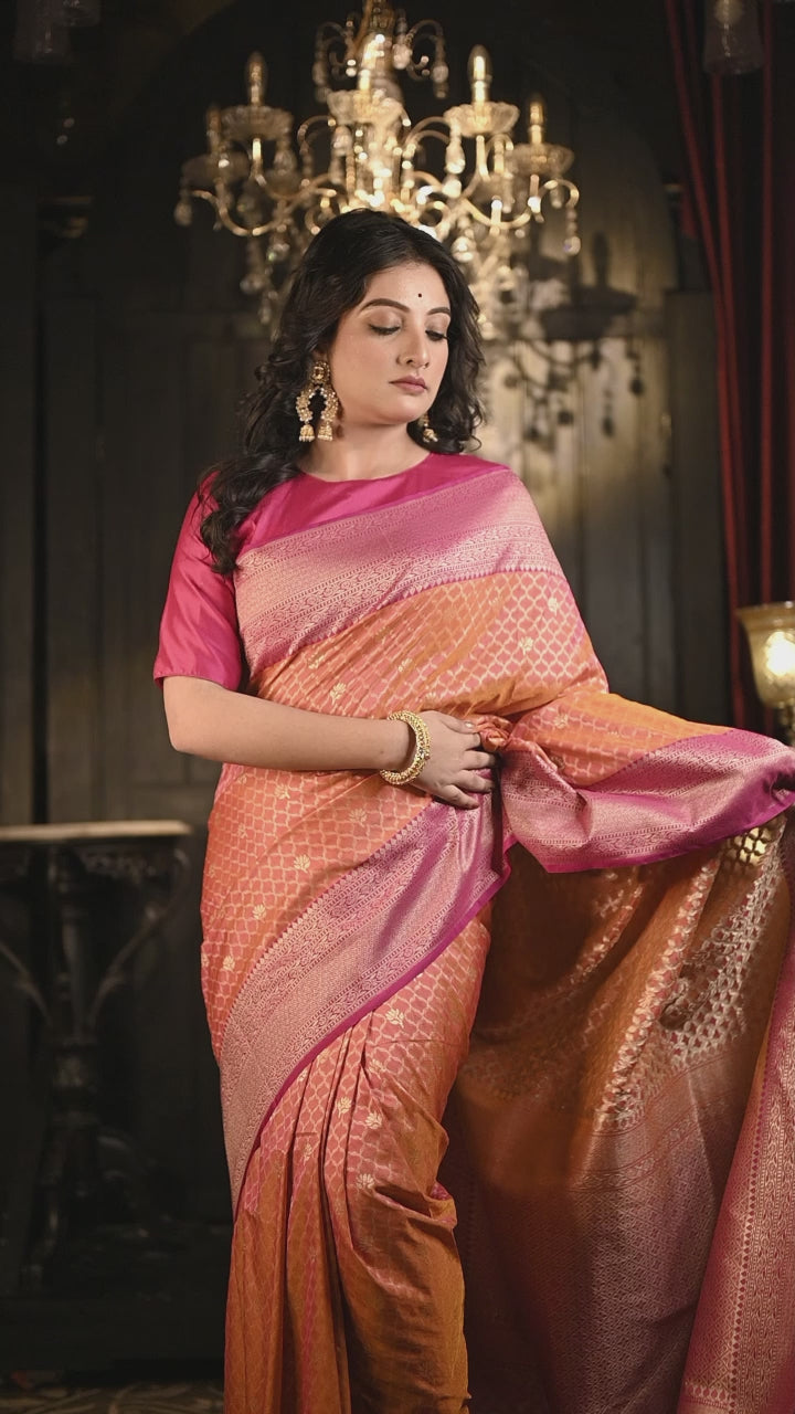 Ahana || Orange Matka Silk Banarasi Saree with Magenta Pink Border and all over Jaal woven in Gold Zari