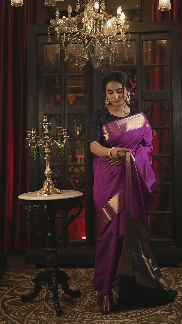 Amita || Purple Plain Body-Brocade Border Soft Katan Banarasi Saree with Navy Blue & Matte Gold Brocade Pallu