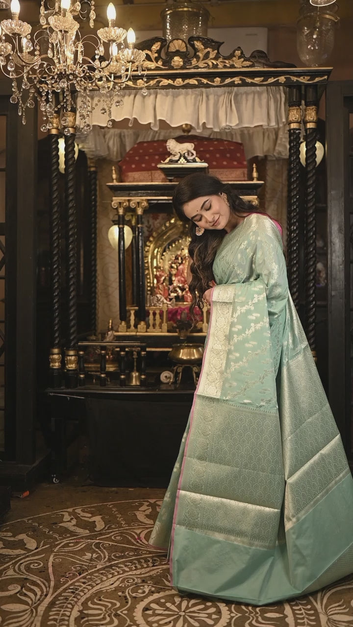 Sea Green Cotton Silk Banarasi Saree from our Sabhyata Collection is a graceful ode to understated celebration. The soft sea green base is beautifully adorned with all-over jaal and buta woven in fine silver zari, lending a gentle shimmer that catches the light with quiet sophistication. Effortlessly refined, this saree is perfect for those who cherish elegance rooted in tradition.