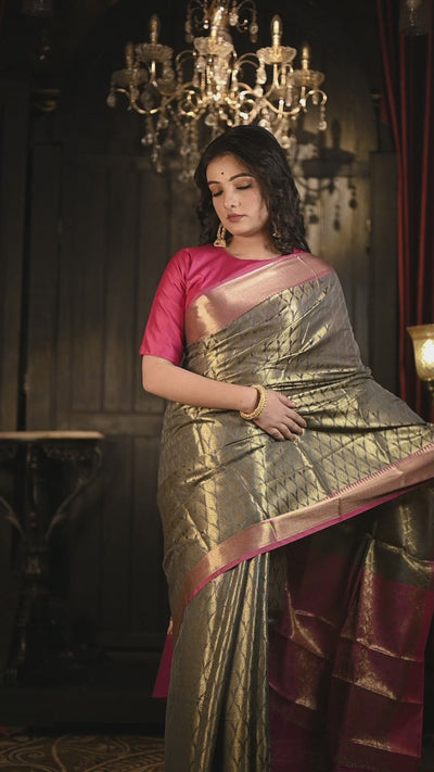 Avartan || Grey Soft Silk Banarasi Saree with all over Buta in Golden Zari and dull Magenta border
