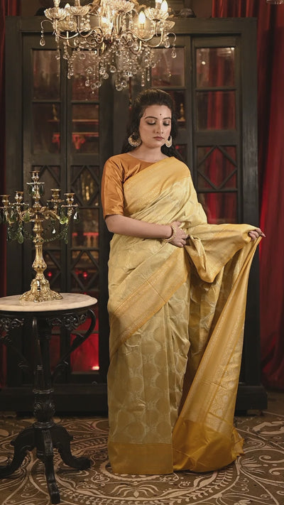 Varnika || Beige Base Matka Silk Banarasi Saree with Mango Yellow border and all over Tree motif woven in Matte Gold Zari