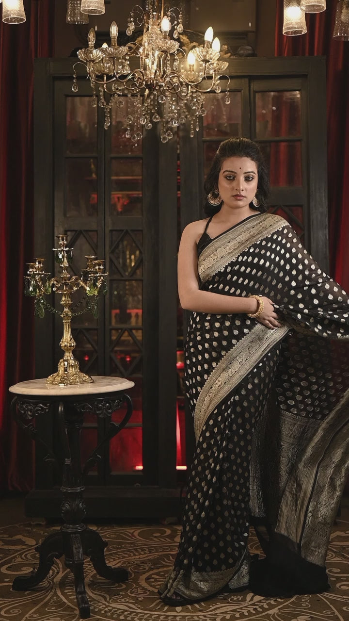 Advika || Black Khaddi Georgette Banarasi Saree with all over Silver Zari Buti