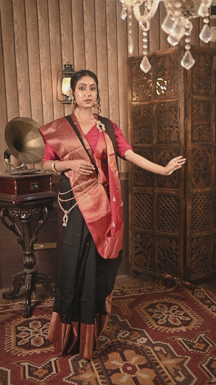 The intensity of black meets the warmth of garnet and antique gold, offering a regal and commanding look. The copper and gold buta add richness without weight, making this saree a versatile option for evening functions, cultural events, or traditional gatherings.