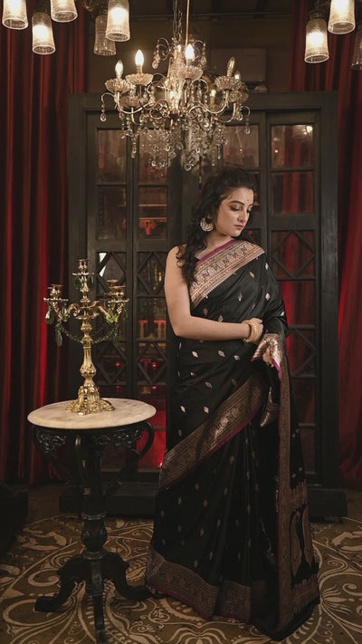 Yamini || Black Banarasi Mashru Silk Banarasi Saree with all over Copper Zari Buta and sleek Magenta border