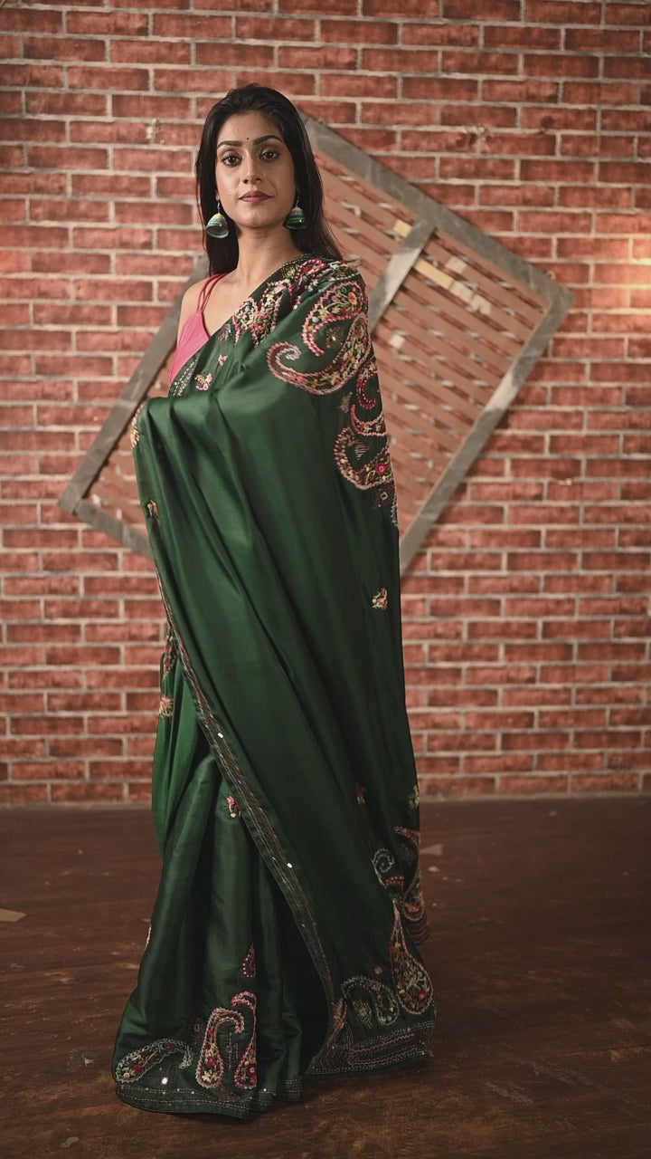 Vrinda || Bottle Green Soft Tussar Silk Hand Embroidery Saree with all over Multi-colour Resham Boolean Floral motif and Sequins & Mirror Highlights