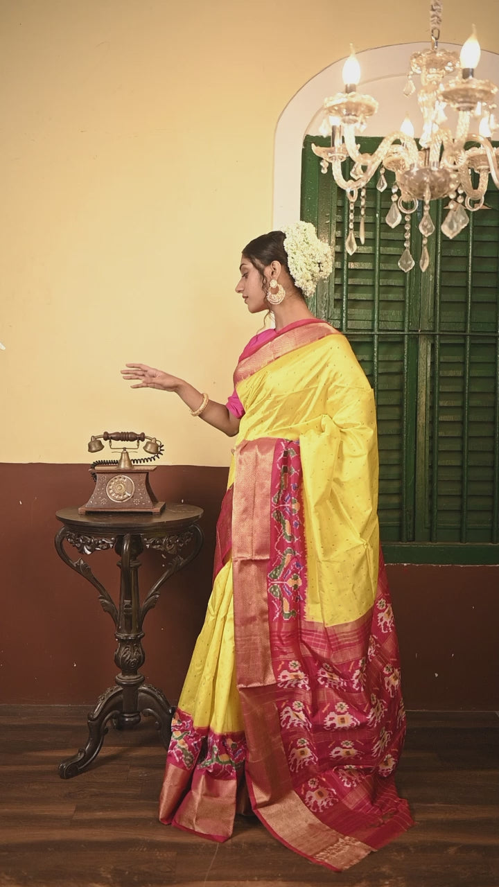 The bold yellow hue paired with the vivid dual-tone border offers a striking palette that’s both festive and timeless. The ikat motifs and zari detailing reflect a deep-rooted weaving legacy, ideal for celebrations, traditional gatherings, and standout moments.