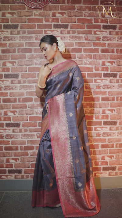 Ishani || Gunmetal Grey Pure Tussar Handloom Banarasi Saree with Kadhiyal lock Antique Zari Buta and Beetroot Pink border