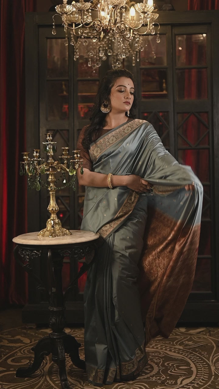 Dhara || Dusty Blue Soft Silk Banarasi Saree with all over Beige & Copper Resham Buta and light Maroon border & Pallu
