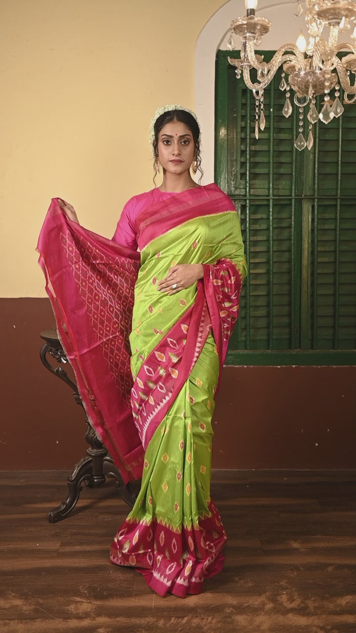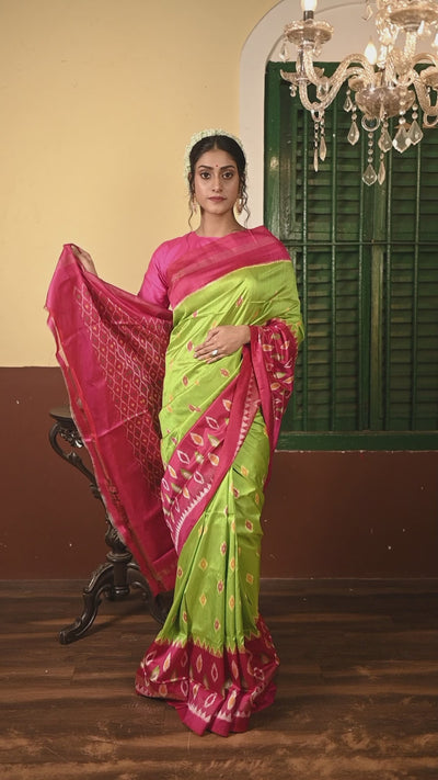 The luminous parrot green base contrasted with the multi-colour ikkat motifs creates a visually captivating effect. The magenta and antique zari border adds richness and tradition, while the intricately woven pallu highlights the craftsmanship behind every thread, making it perfect for festive occasions and cultural celebrations.