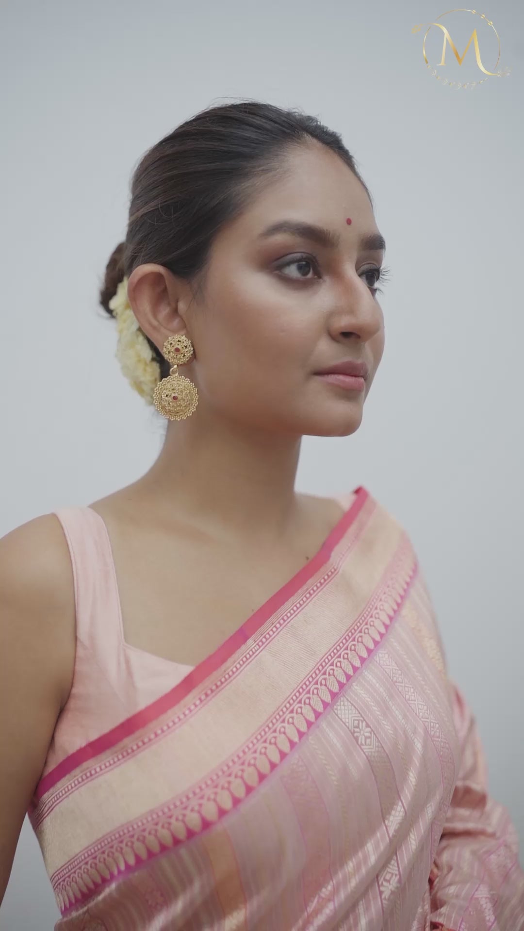 Delicate yet striking, the Pastel Pink Pure Katan Handloom Banarasi Saree from our Adwitiya Collection captures the essence of quiet luxury. Woven in fine pure Katan silk, this saree features all-over 'Sona-Rupa' zari kadhua stripe detailing—an elegant interplay of gold and silver threads that lends a subtle shimmer to its soft pastel base. Framing this understated body is a rich magenta pink border, adding a vibrant contrast that elevates the overall look.