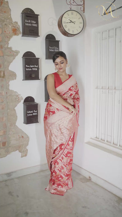 Mohini || Bright Red Khaddi Georgette Banarasi Saree with all over Rifling Handbrush Multi-colour & Matte Gold Zari Floral motif and Jaal