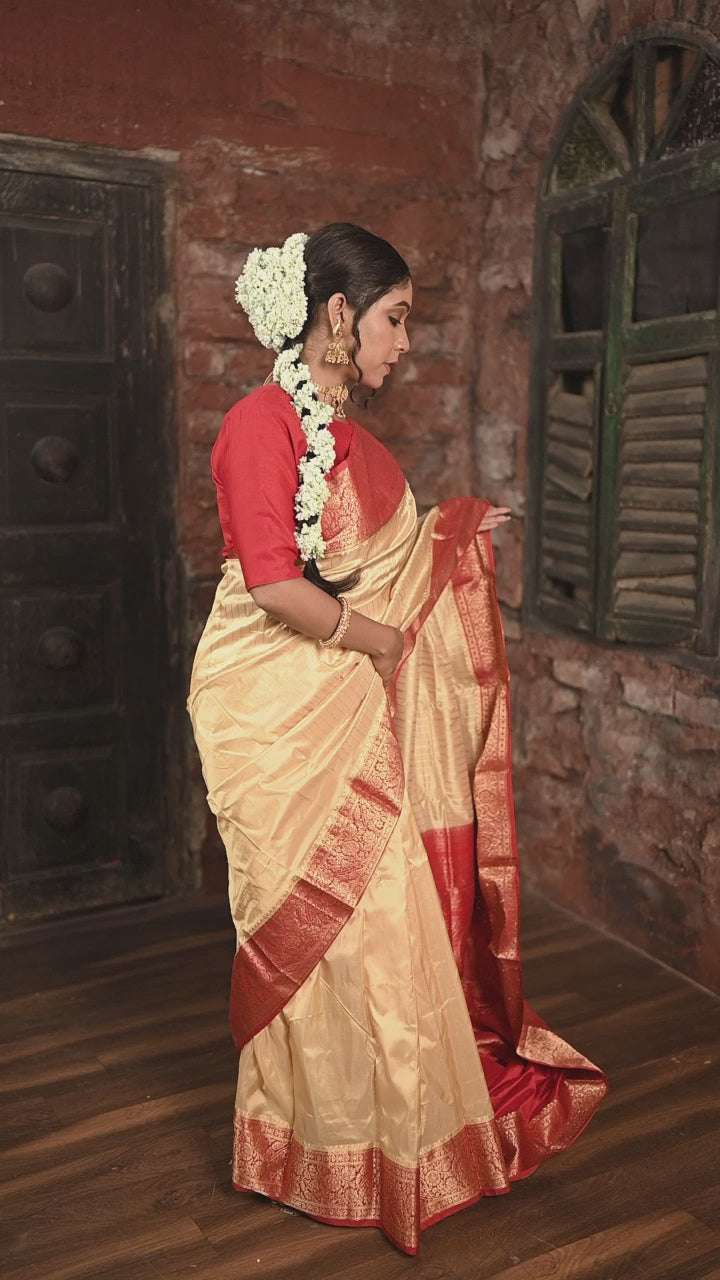 The serene golden beige hue is beautifully uplifted by the vivid red border, creating a harmonious balance of subtlety and richness. The refined zari detailing throughout the saree showcases the artistry of seasoned weavers, while the ornamental pallu motifs serve as a nod to timeless South Indian aesthetics. Ideal for milestone celebrations, intimate rituals, or heritage-inspired looks, this saree carries both legacy and versatility.