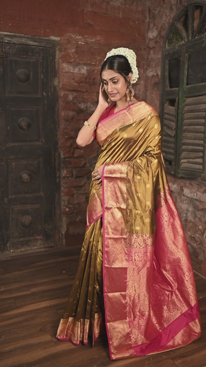 Mrunalini || Olive Brown & Gold dual tone Pure Kanjivaram Silk Handloom Saree with all over Golden Zari 'Peacock' motif Buta, Magenta broad & Golden Zari Border and traditional design Pallu