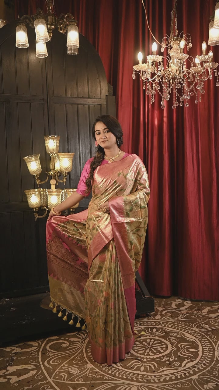 Ishya || Light Gold Pure Tissue Banarasi Handloom Saree with all over Multi-colour Floral Jaal, Magenta Pink border & Antique Gold Pallu