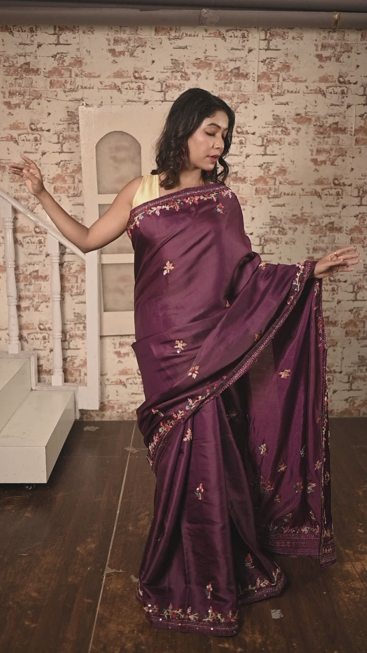 A rich and elegant drape from our Anokhi Collection, the Grapevine Soft Tussar Silk Saree is a celebration of subtle opulence and handcrafted beauty. The deep, wine-toned tussar silk base is adorned with all-over multi-colour resham Boolean floral motifs, each intricately hand-embroidered. Sequins highlights are delicately scattered across the surface, adding a refined touch of shimmer to its textured elegance.