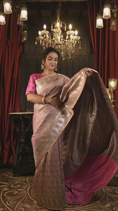 Bhavya || Mauve & Teal Green traditional Banarasi Jamawar Saree on Champagne Gold Katan with all over Matte Gold Zari highlights Buta, Border & Pallu