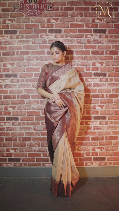 Aishani || Beige Pure Tussar Handloom Banarasi Saree with Kadhiyal lock Antique Zari Buta and Dark Chocolate Brown border