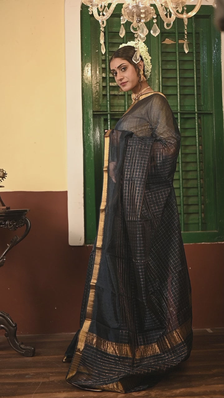 Leepakshi || Dark Peacock Blue & Black Resham Striped Cotton Mangalgiri with all over Antique Gold Zari Checks, Traditional Border & Pallu with Stripe & Checks