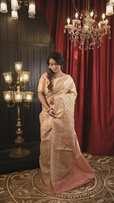 A serene statement from our Anokhi Collection, the Mint Green & Dusty Pink Rangkaat Pure Organza Banarasi Saree is a poetic blend of pastel elegance and meticulous craftsmanship. Handwoven in airy pure organza, it features intricate matte gold zari butis scattered across the body and a delicate jaal pattern that adds texture and visual richness.