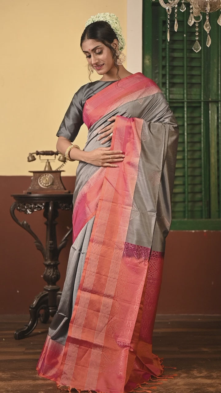 Veena || Slate Grey Pattu Soft Silk Handloom Saree with all over Antique Copper & Antique Silver Zari Traditional Buta, Magenta Pink & Orange dual-tone Border and Pallu with Antique Copper & Antique Silver Zari Traditional design