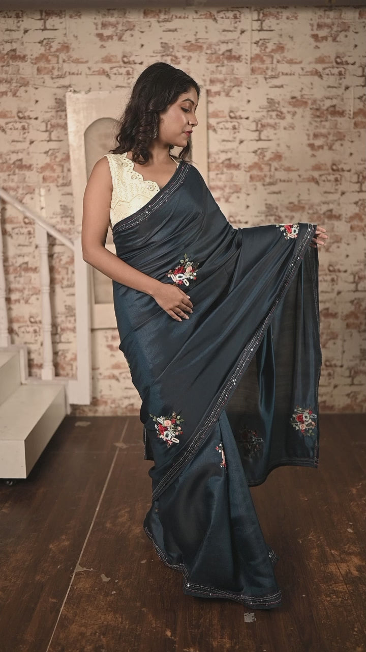 Kamya || Midnight Blue Soft Tussar Silk Hand Embroidery Saree with all over Multi-colour Resham Boolean Floral motif and Sequins & Mirror Highlights
