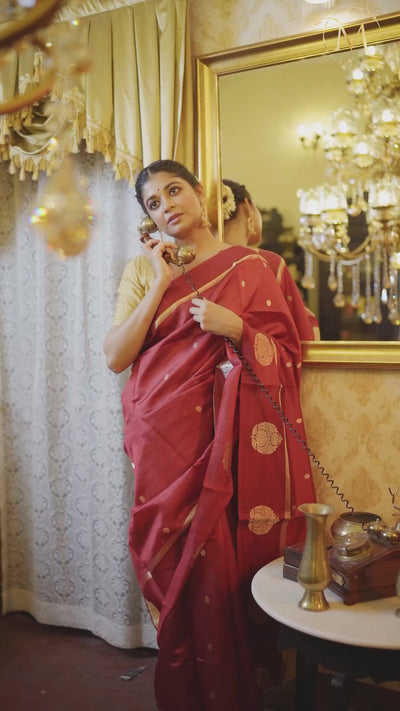 Ranjika || Maroon Pure Katan Handloom Banarasi Saree with all over 'Sona-Rupa' Kadhua Buti and Floral Motif border
