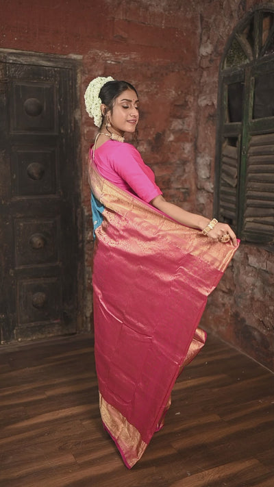 The rich peacock blue color contrasted with the bright magenta border creates a striking and harmonious palette. The intricate golden peacock motifs symbolize beauty and grace, expertly woven to elevate the saree’s grandeur. Perfect for festive occasions, weddings, and cultural celebrations, this saree promises to make a memorable impression.