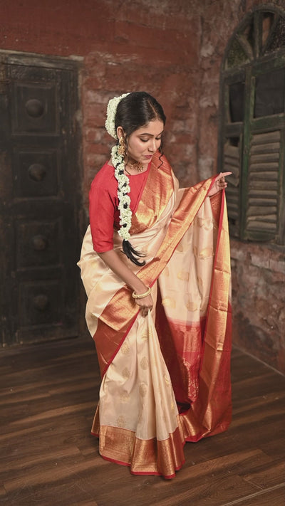 Chinmayi || Ivory Gold Pure Kanjivaram Silk Handloom Saree with all over Golden Zari traditional Buta, Red broad & Golden Zari Border and traditional Floral motif Pallu