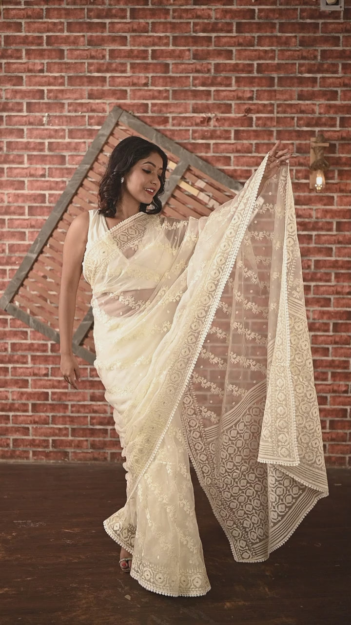 The serene ivory hue evokes purity and timeless charm, making it an ideal choice for intimate gatherings, daytime occasions, or elegant soirées. Ethereal in texture and effortless in drape, this saree perfectly balances heritage artistry with modern sophistication.