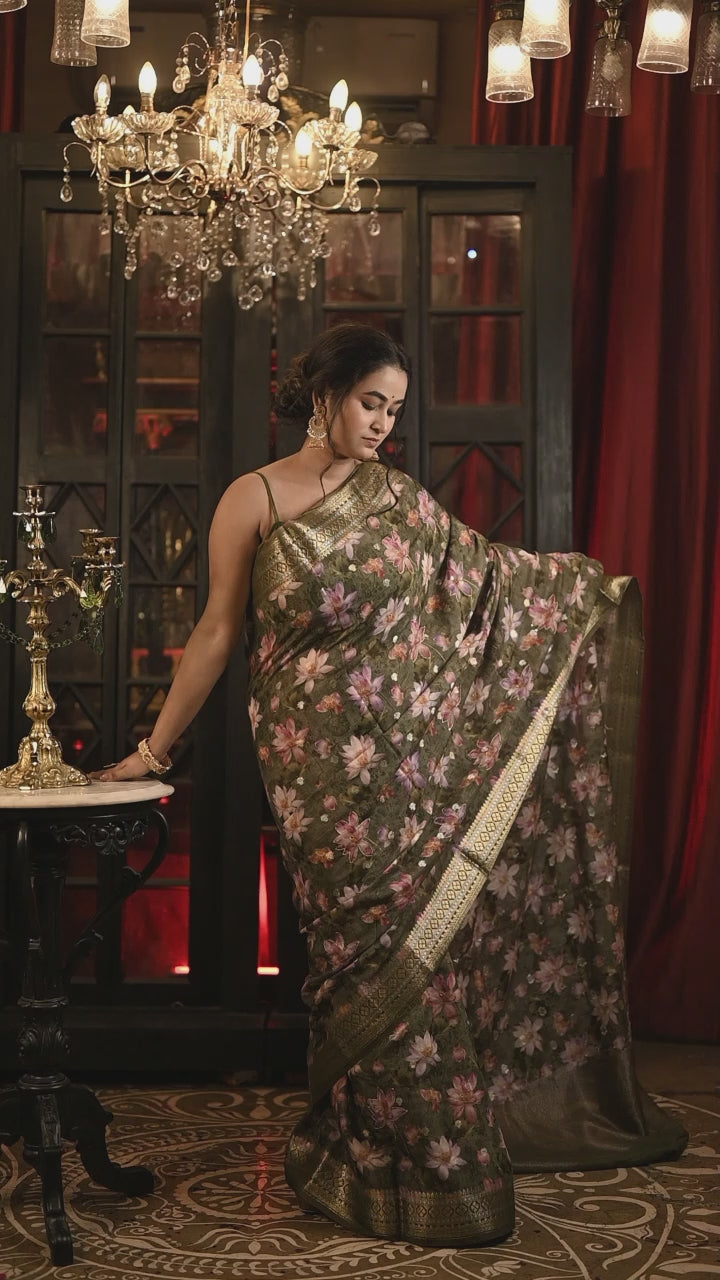 Kumud || Moss Green Chanderi blend Banarasi Saree with all over Floral Digital Print and Sona Rupa Buta with Mirror & Gold Zari highlights