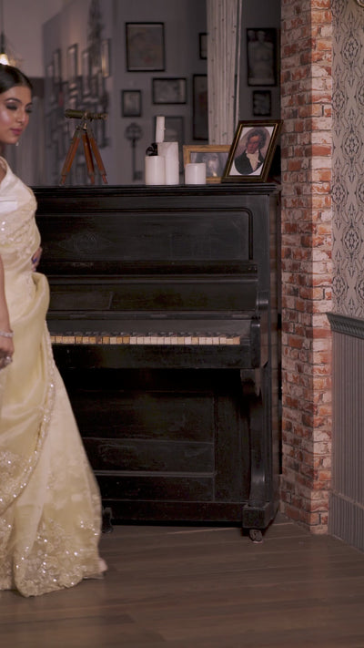 Soft, luminous, and effortlessly graceful, the Pastel Yellow Pure Organza Fancy Saree is a breath of fresh elegance. The all-over cut-dana sequins handwork buti sparkles delicately across the sheer organza fabric, while the border and pallu are richly embellished to create a harmonious balance of shimmer and sophistication. Perfect for daytime festivities, receptions, or any occasion where subtle glamour is desired.