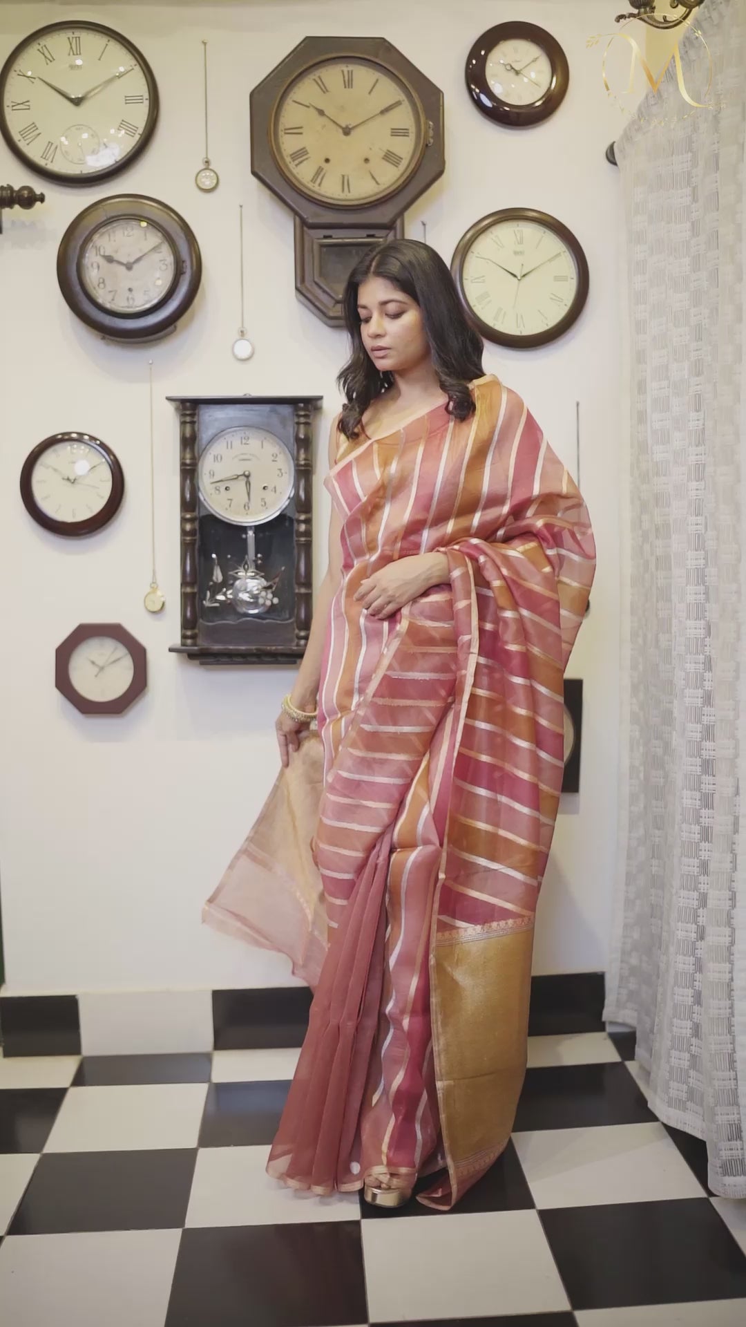 Tanvi || Rose Taupe, Mocha Gold & Onion Peel shade Rangkaat Kora Silk Handloom Banarasi Saree with half & half 'Sona-Rupa' Zari Kadhua Buta and Stripes