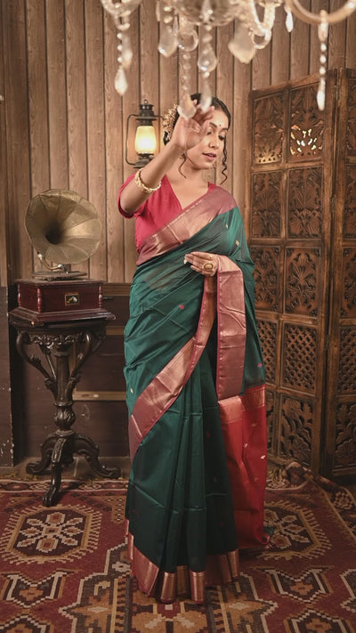 The deep forest green tone combined with the intense red and gold detailing gives this saree a classic yet striking appearance. The golden zari work adds a celebratory touch, making it perfect for festivals, traditional events, or elegant daytime occasions.