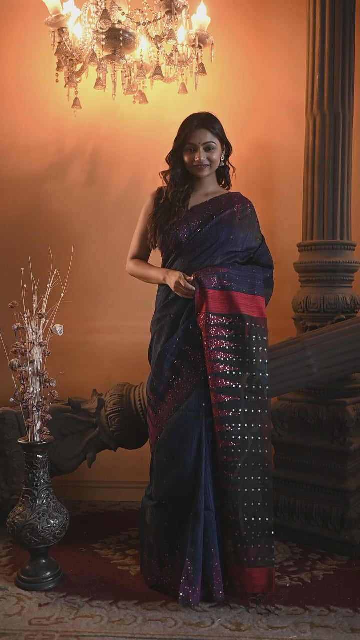 Timeless and vibrant, this saree from our Halki Phulki Collection masterfully blends classic elegance with striking details. The Midnight Blue Premium 'Matka-Muslin' half & half Bengal Handloom Saree features all-over antique gold small sequins, paired with a bold red temple border and a multi-colour floral jamdani design on the black pallu, showcasing exquisite craftsmanship.