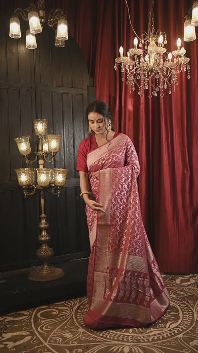 Mridula || Beetroot Pink Munga Banarasi Saree with all over Jaal woven in Silver Zari