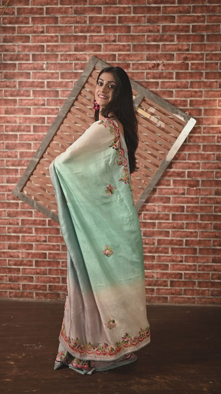 A dreamy blend of colour and craftsmanship from our Anokhi Collection, this 4D Tie & Dye Pure Tussar Silk Saree is a celebration of fluid hues and timeless hand embroidery. The saree transitions seamlessly across tones of off-white, sky blue, dusty blue, and lavender—each shade flowing into the next through an artisanal tie & dye technique that gives it a painterly, almost ethereal quality. All-over multi-colour resham Boolean floral motifs are delicately hand-embroidered, with subtle sequins highlights adding a gentle shimmer.
