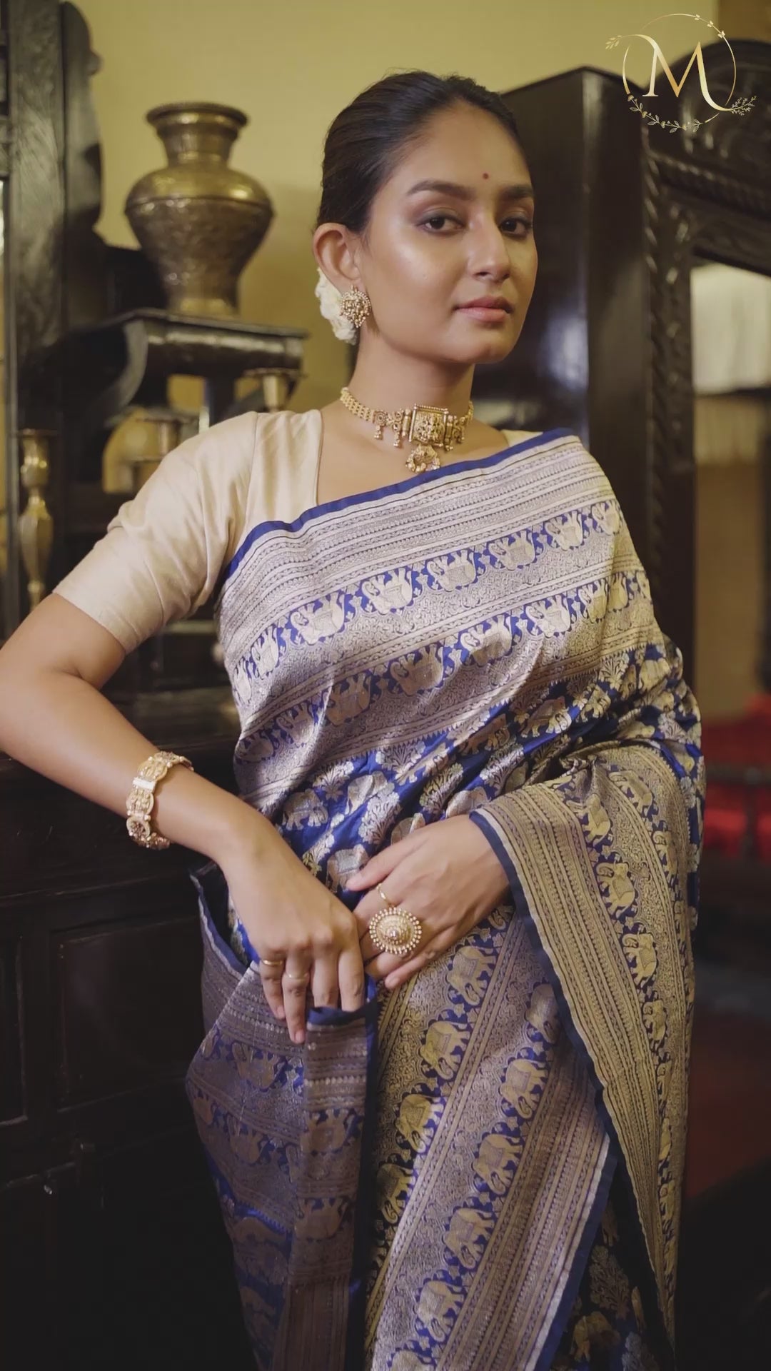 Gajalakshmi || Navy Blue Pure Katan Handloom Banarasi Shikargah Saree with all over Elephant motif in 'Sona-Rupa' Zari