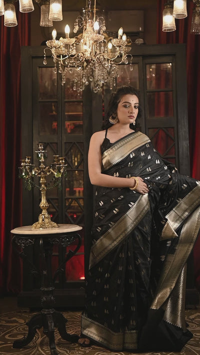 Nishitha || Black Mashru Silk Banarasi Saree with all over Buta and Border in Silver Zari