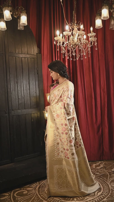 Bahar || Off-White Soft Katan Banarasi Saree with all over multi-colour Floral Jamawar design and Jaal in Golden Zari