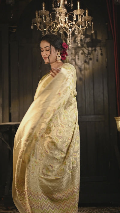 Iva || Ivory Khaddi Georgette Banarasi Saree with all over Rifling Handbrush Multi-colour & Matte Gold Zari Floral motif Jangla