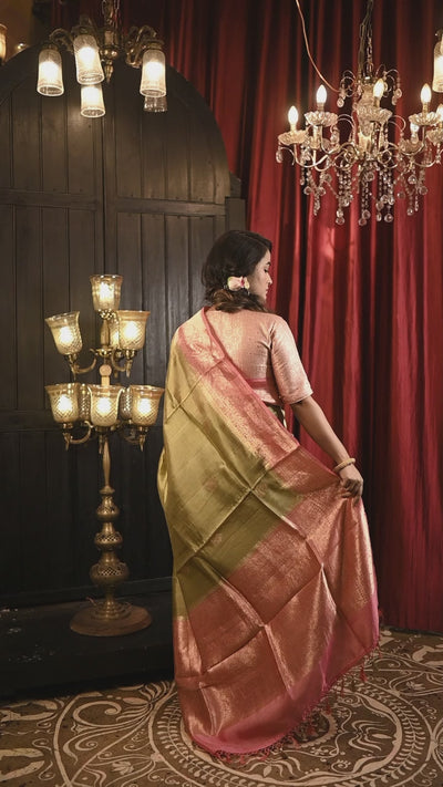 Hema || Light Golden Olive Pure Raw Mango Silk Handloom Banarasi Saree with all over Antique Gold Zari Kadhua Buta and French Dusty Rose Pink border
