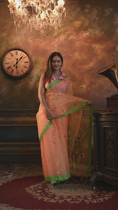 Soft and radiant, this saree from our Tilottama Collection is a delicate celebration of Bengal’s rich handloom heritage. The Light Orange & Lemon Yellow dual tone Premium Muslin Bengal Handloom Saree features all-over multi-colour buta motifs that bring subtle vibrancy to the fabric, complemented by a beautifully crafted ‘floral’ jamdani pallu that adds intricate artistry and finesse.