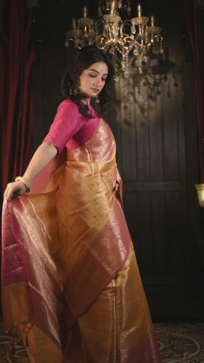 Parnika || Mango Yellow & Gold dual-tone Soft Silk Banarasi Saree with all over tree motif in multi-colour Resham & Golden Zari with Coral Pink Mahapadh Border