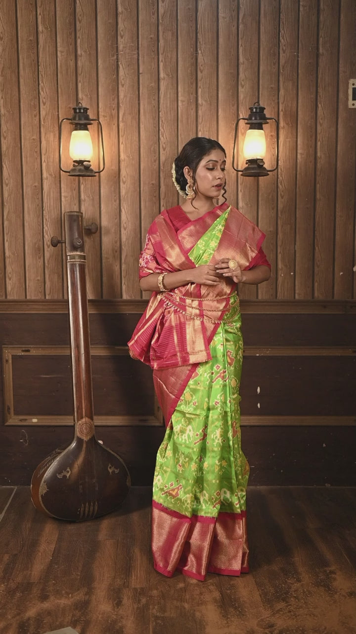 The vivid parrot green body contrasted with the deep beetroot pink border creates a dramatic visual harmony, while the intricate ikkat and zari detailing reflects the depth of traditional Pochampally weaving. Elegant yet bold, this saree is perfect for cultural celebrations, weddings, or festive events.