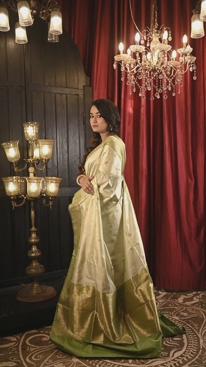 Design / Weave: All Over Gold Zari Kadhua Buta and Pastel Green Border