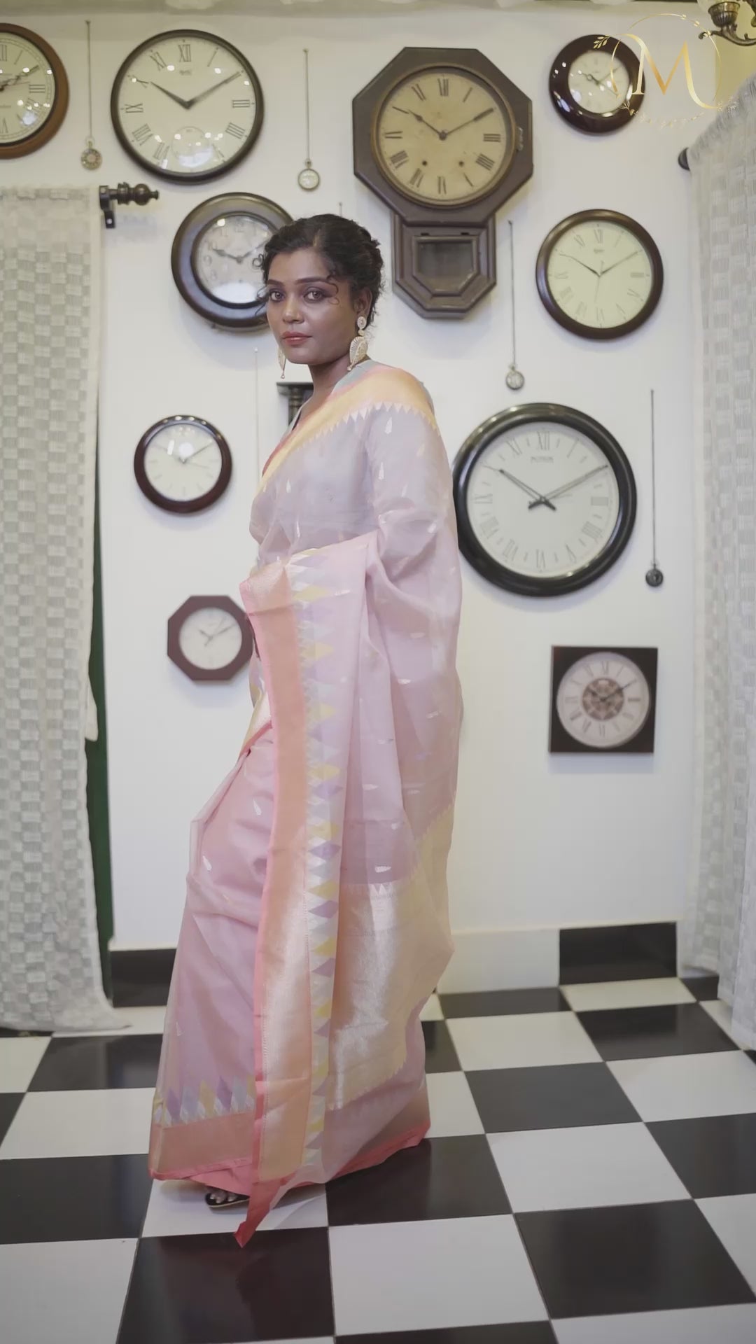 Soft, graceful, and refreshingly modern, the Pastel Pink Pure Kora Silk Handloom Banarasi Saree from our Adwitiya Collection brings together delicate tradition and artistic flair. The sheer, lightweight texture of pure Kora silk provides a dreamy canvas for all-over 'Sona Rupa' zari kadhua buta—a blend of gold and silver threads meticulously handwoven for subtle sparkle and refined richness.