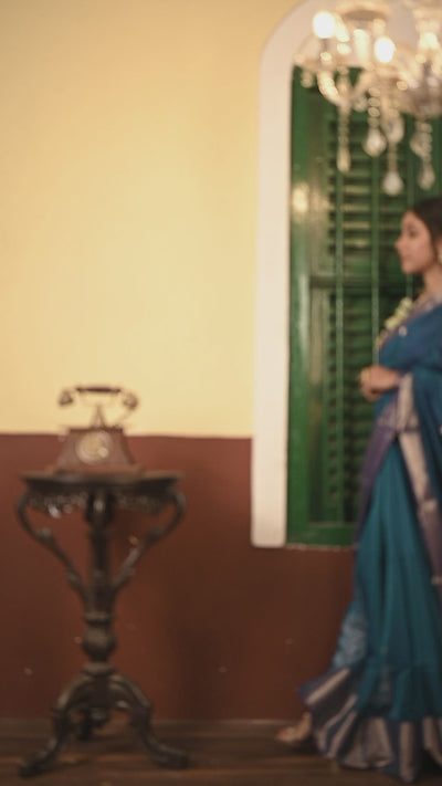 The vibrant interplay of blue and violet gives this saree a luminous visual depth, while the antique zari accents add a layer of traditional charm. The elegant brocade detailing and dual-tone body make it a beautiful choice for festive mornings, family occasions, or semi-formal gatherings.