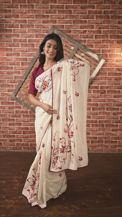 The pristine white hue offers a canvas of purity and grace, beautifully offset by the rich palette of the embroidery. Perfect for intimate celebrations, formal occasions, or festive evenings, this saree embodies refined charm with a contemporary spirit.