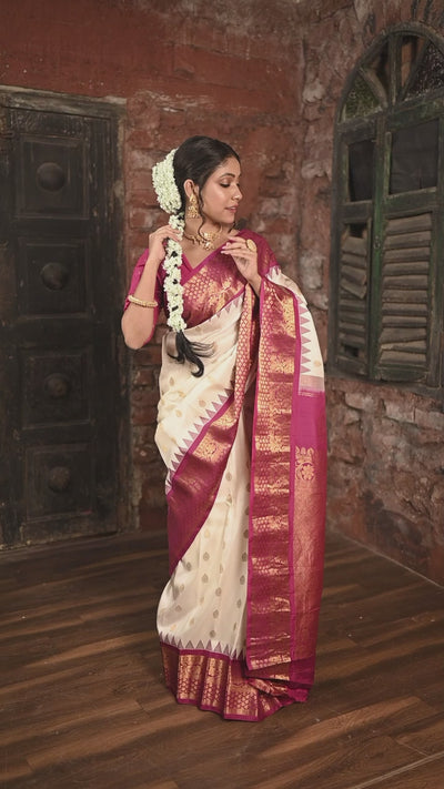 The serene off-white silk sets a refined base for the vivid magenta border, making the gold buti shimmer gently across the body. The contrast between the plain body and rich brocade pallu gives the saree a balanced elegance, making it ideal for weddings, festive rituals, or heirloom gifting.
